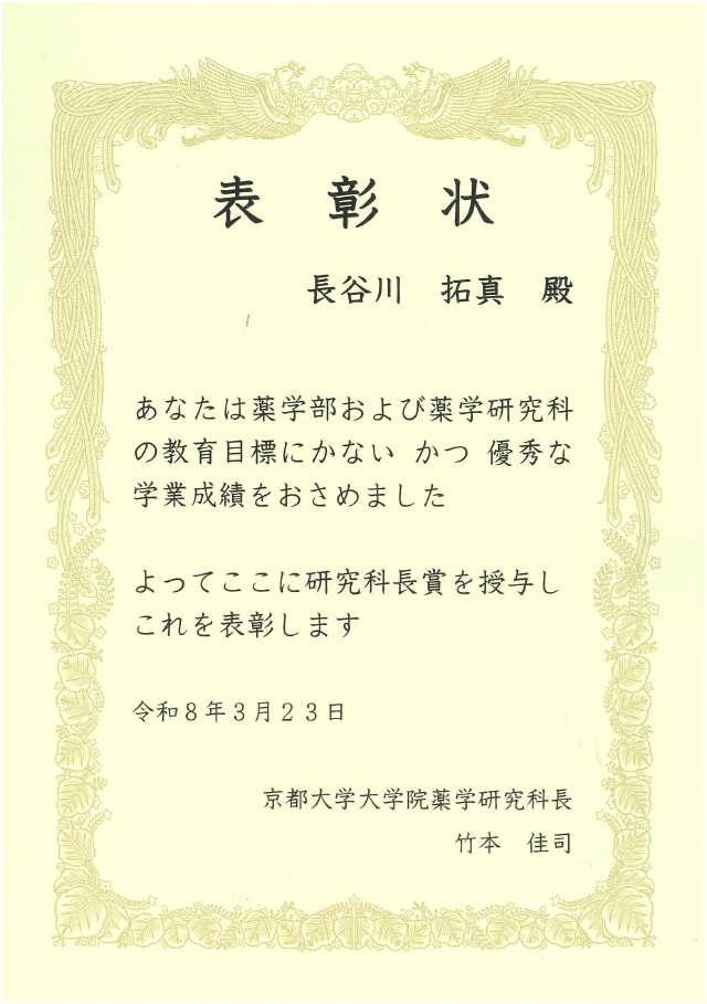 長谷川拓真さん(iD2)が研究科長賞を受賞しました。