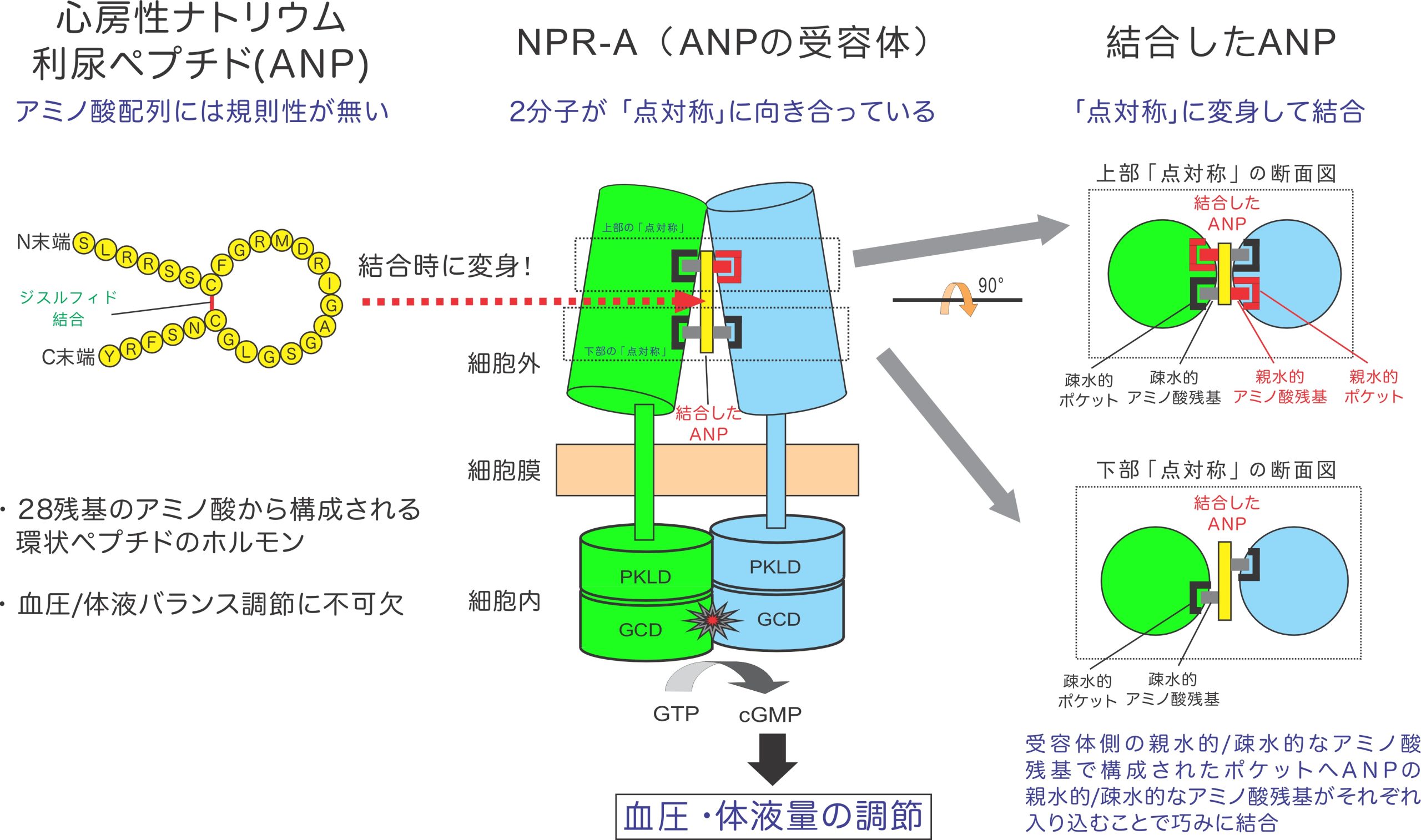 また最近では、「点対称」を持って向き合ったNPR-Aが、その一次配列に対称性を全く持たない1分子のANPを認識できるという興味深い機構、すなわち「結合したANPが擬似的に点対称の形をとることで、点対称に配置した2分子のNPR-Aに認識される機構」を世界で初めて解明することに成功しました(FEBS J 2024)。これは、NPR-AとANPの複合体構造を高分解能で決定し、独自の解析技術を開発・駆使することで得られた成果です(図)。